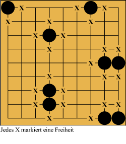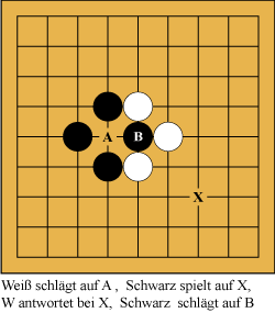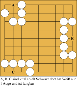 Spielt weiß auf „A“, „B“ oder „C“ dann besitzt seine Gruppe 2 getrennte Schnittpunkte in die man gleichzeitig setzen müsste um alle Freieheiten der weißen Gruppe zu besetzen. Würde Schwarz auf „A“, „B“ oder „C“ spielen dann könnte er durch auffüllen der der freien Schnittpunkte alle Freiheiten besetzen bis nur noch eine übrig ist und dann die obige Regel zum tragen kommt.